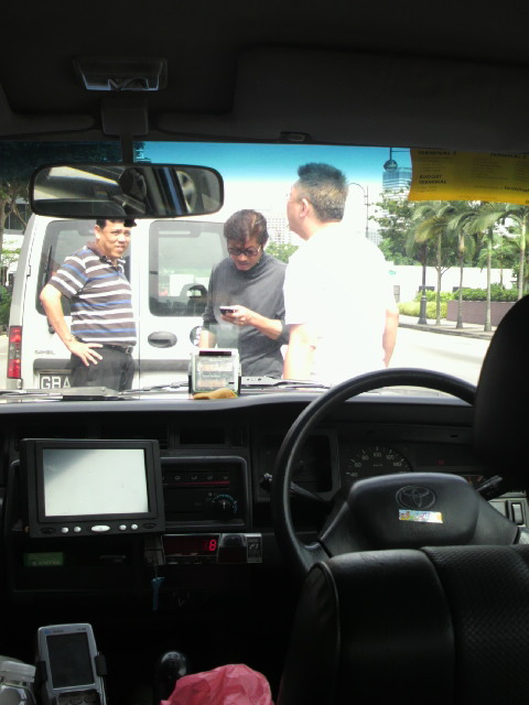 写真は前の車とタクシー運転手が連絡先を交換してるところ。